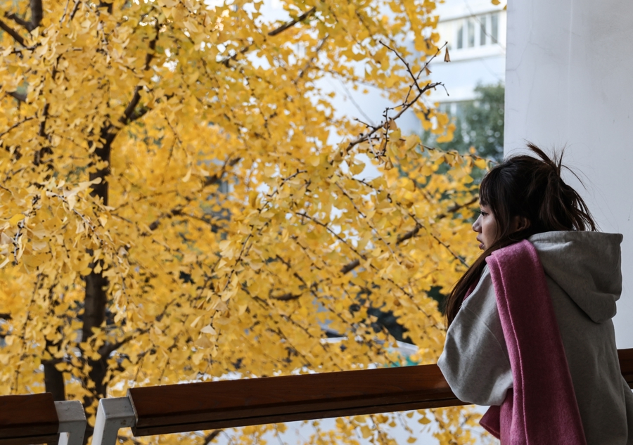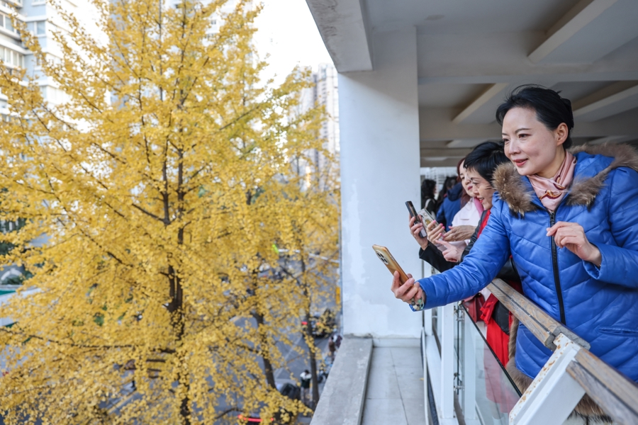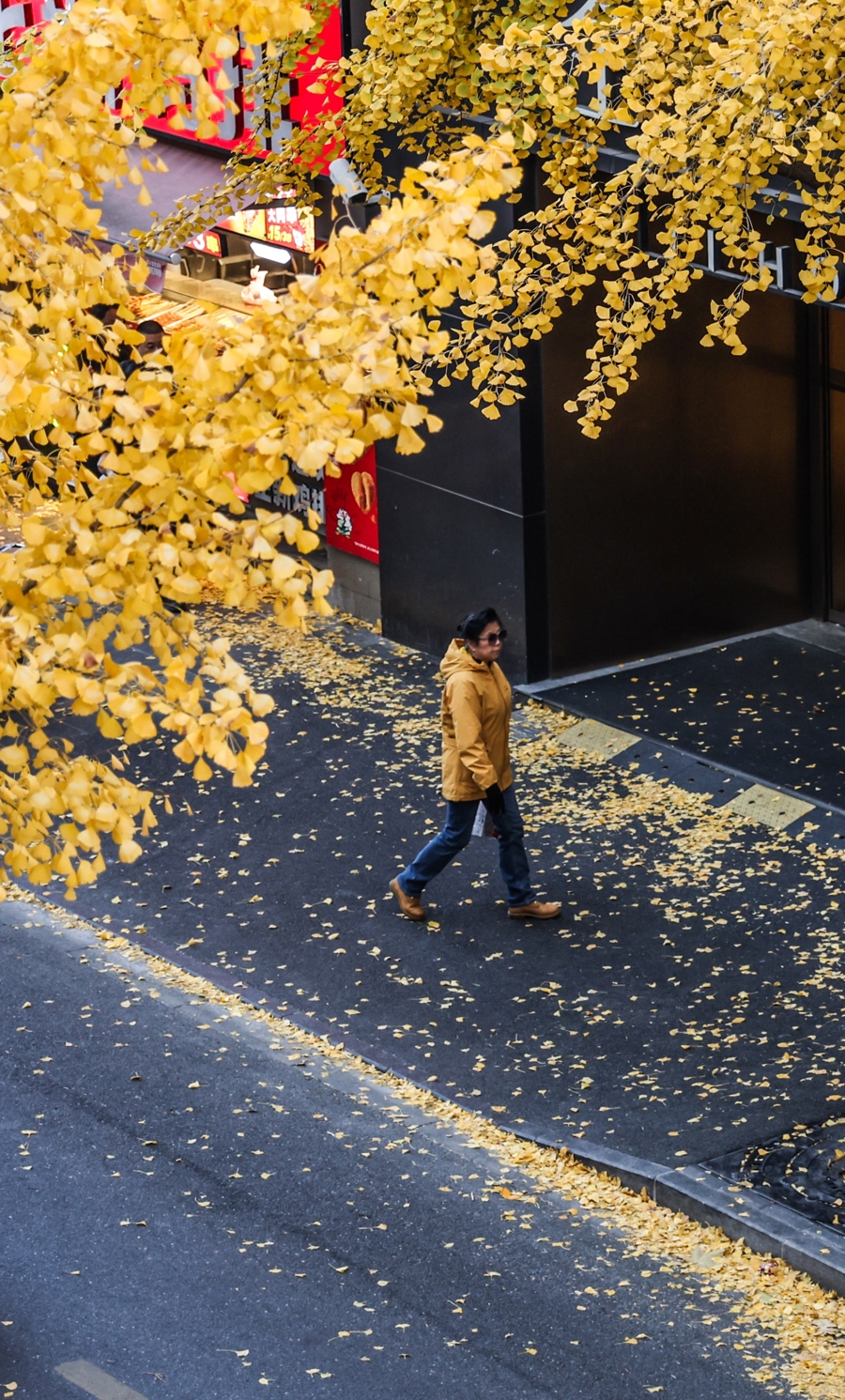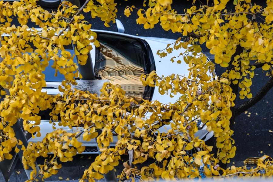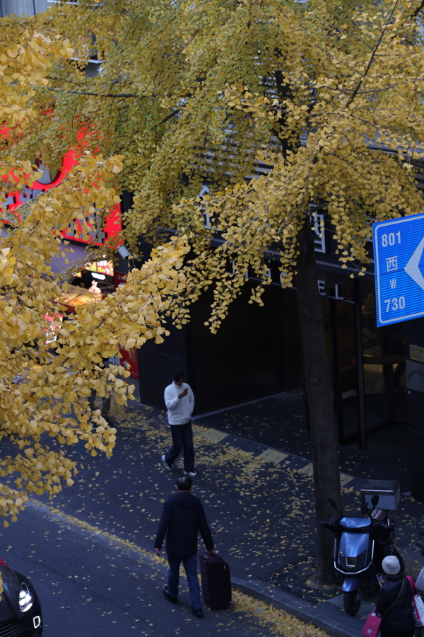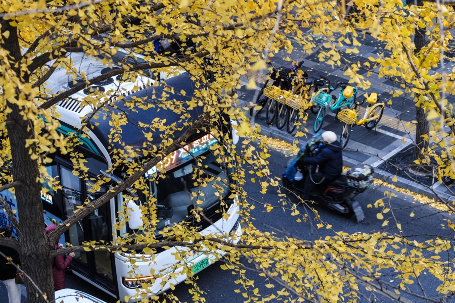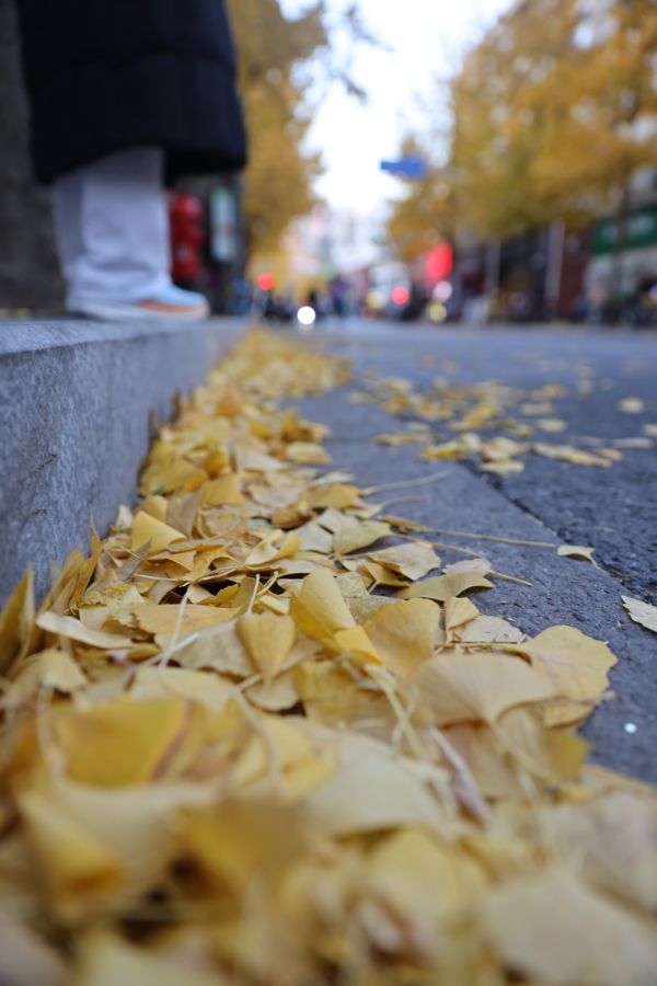 记者在现场看到,银杏叶片已大面积转黄,形成独特的街景。金黄的银杏树穿过沿街的电话亭、公交站牌,一步一景让人心醉神怡。