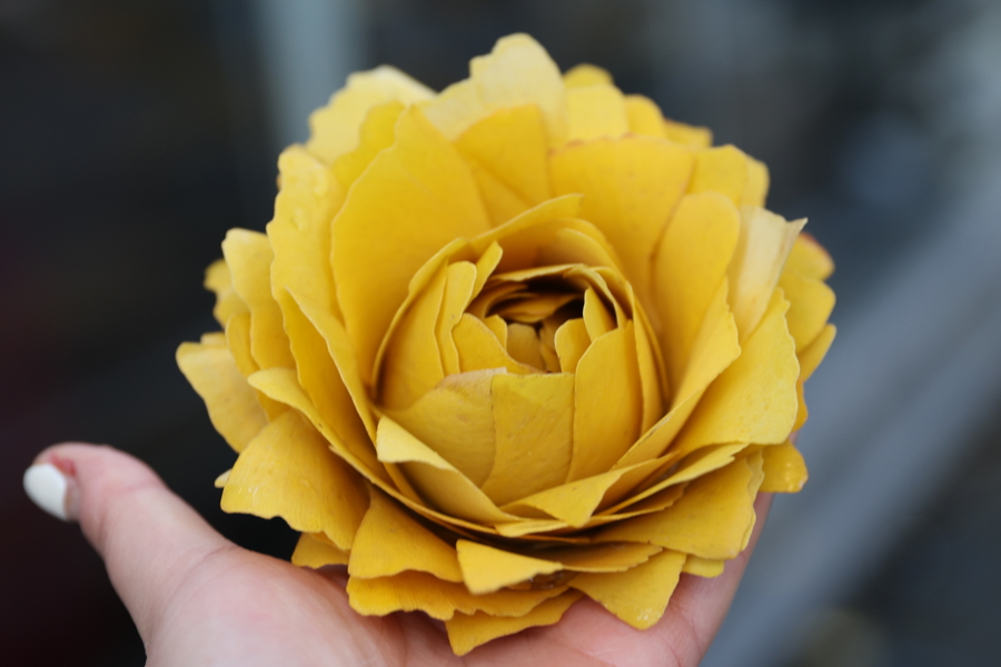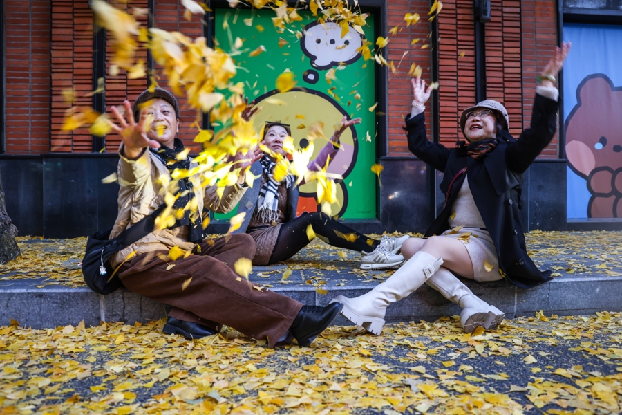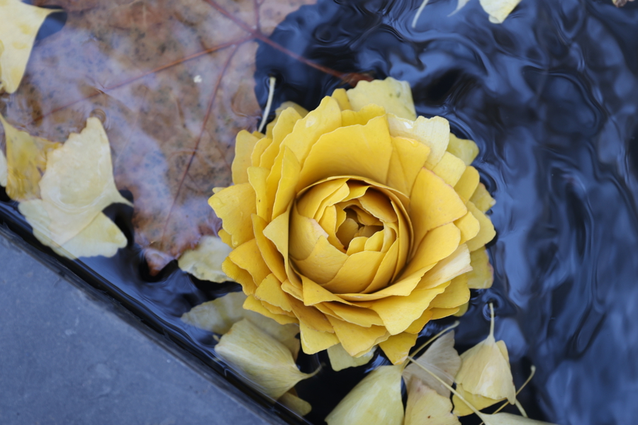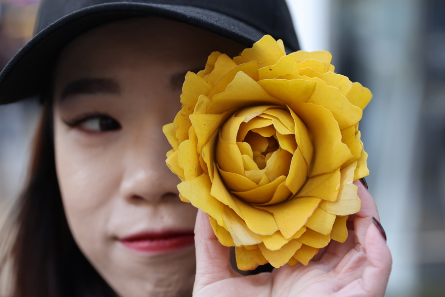 有心人用巧手将落下的金黄银杏叶做成花朵形状,让路人爱不释手,纷纷与之同框。